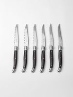 Made by master cutlers in France, every Laguiole tool has to go through 50 quality control steps to pass inspection. These tools are imbued with French passion and a deep love for food, and are made 100% in France. Designed with the signature bee on the handle, these are the real deal. Set includes 6 steak knives. Comes with an etched wooden storage block.