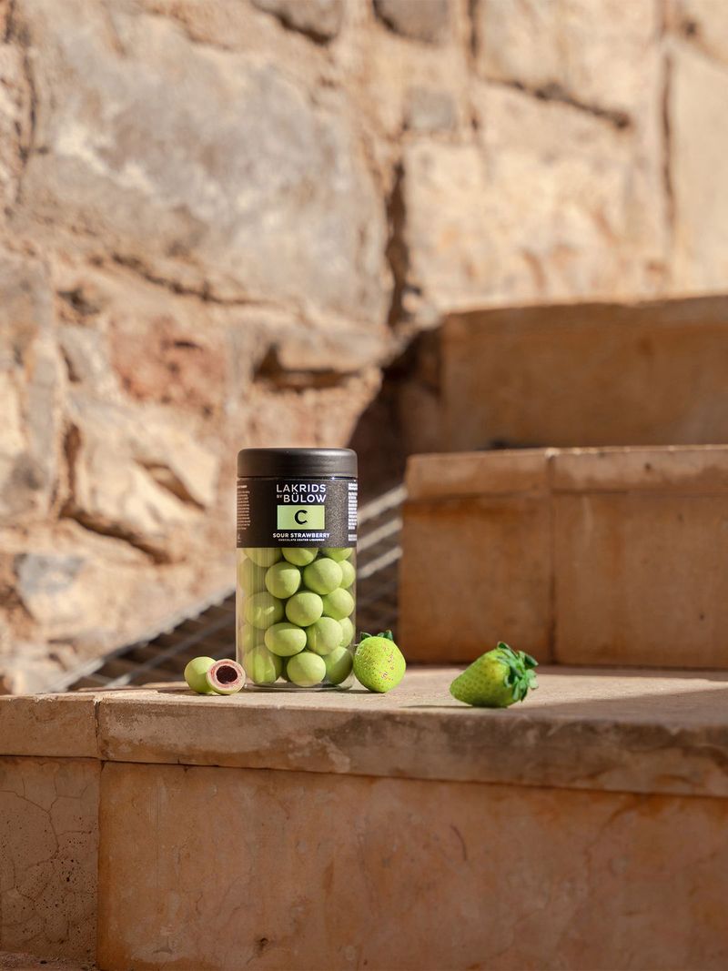 Lakrids by Bülow C Sour Strawberry Chocolate Coated Red Liquorice offers a unique taste experience. Imagine freshly picked green strawberries together with exquisite red liquorice in a sweet, fruity bite. Enjoy how fresh and sour notes from crispy, green strawberries are perfectly balanced with chewy red liquorice, all swirled in silky white chocolate and a crunchy, green sugar shell for an extra sour twist.
