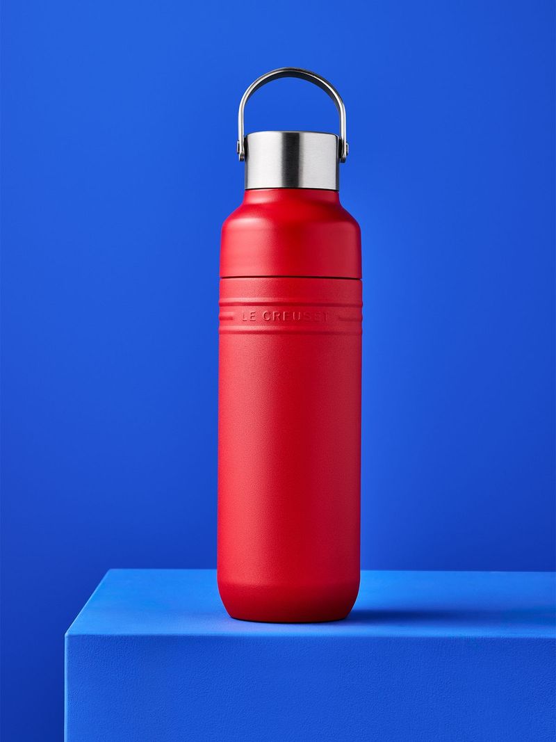 Stay hydrated on the move with the Le Creuset On The Go Bottle. Its dual-opening design includes a wide mouth for adding ice and a smaller spout for easy sipping. With a secure carry handle and leak-proof construction, this travel bottle fits neatly in your bag and helps you stay refreshed throughout your day with no leaks or hassle. Double wall insulation keeps drinks hot or cold and prevents condensation, while the leak-proof vacuum seal minimises spills. The durable powder coating and branded non-slip base bring Le Creuset's signature style to the design.
