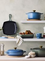 The Chambray range from Le Creuset is the perfect pastel blue shade to elevate and lighten your cooking space. The Le Creuset Signature Skillet features a helper handle for easier lifting and added control when moving between stovetop, oven and table. This kitchen staple is ideal for stovetop frying and oven baking.