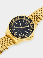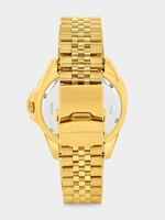 A testament to expert design and craftsmanship, this stylish watch features a Gold Plated round case with a Black Plated top ring, sleek black dial with a date window and Gold Plated Stainless Steel bracelet strap. Special features include 5 ATM water resistance. It boasts Japanese quartz movement protected by a 5-year guarantee.