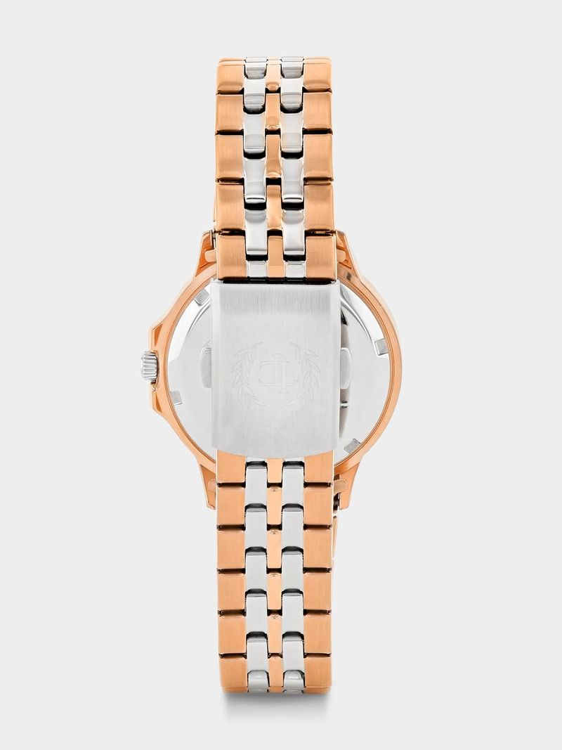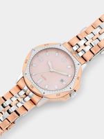 This stylish fully Stainless Steel diver watch features a Rose Plated round case, pink Mother Of Pearl dial with Japanese Quartz movement and two-tone bracelet strap. Special features include a calendar function, 50 metre water resistance and a 5-year guarantee.