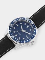 This stylish fully Stainless Steel diver watch features a Silver Plated round case with a Navy and Black Plated top ring, navy dial with Japanese Quartz movement, and navy genuine leather strap. Special features include 50 metre water resistance and a 5-year guarantee.
