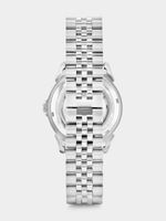 This stylish Stainless Steel bracelet watch features a round case and black skeleton dial. Designed to tick on time with a built-in rotor, this self-winding watch does the work for you and, as it boasts a 40-hour power reserve, no batteries are required. Crafted from solid steel with 50 metre water resistance, an elegant glass case reveals it’s automated brilliance from the front as well as the back.