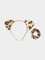 Add a playful touch to her hair with our leopard print faux fur scrunchie and aliceband set. This set is perfect for adding a fun twist to any outfit.