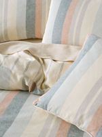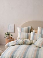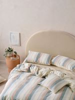 The Linen House Reverie Duvet Cover Set in Saltwater brings soft tones and classic stripes to the bedroom. Yarn-dyed for gentle colour, wide vertical stripes in saltwater, sky and praline hues reverse to a simpler stripe on the other side. Beautifully woven from a soft cotton and linen blend that gives it a lovely drape and texture, this set is perfect for a contemporary bedroom.