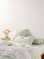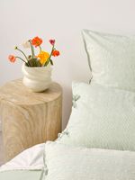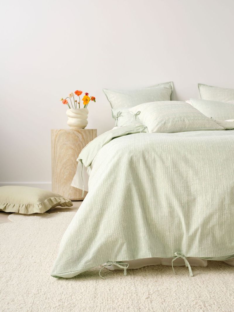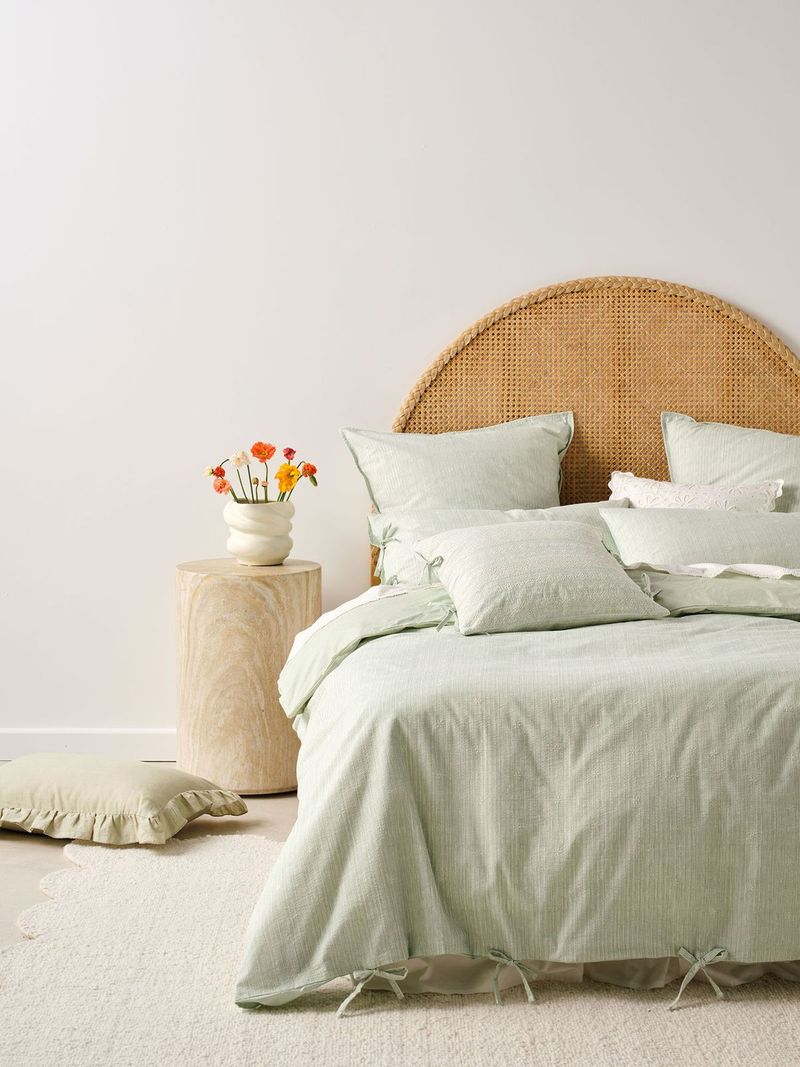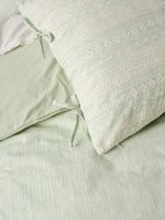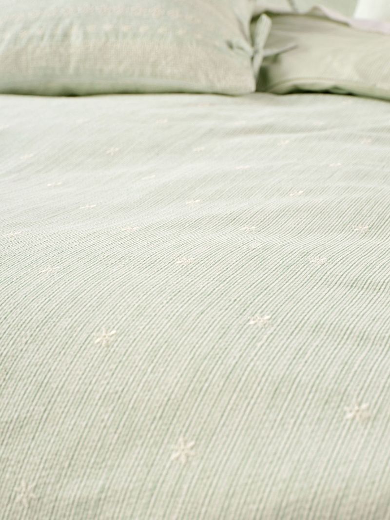 The Linen House Lisette Duvet Cover Set in Sea Glass is made from beautiful broderie anglais across cotton seersucker in a tranquil shade. Lisette is a pared-back combination of fine printed stripes with embroidery, creating nostalgia with a modern sensibility. This set is finished with pretty tie closures, that work back with its coordinating European pillowcases.