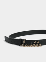 Complete your look with the Luella Embossed Script Clasp Belt. The slim belt is flattering while the Luella logo clasp makes a statement. Coordinate with matching gold-tone accessories for a cohesive look.