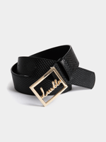 Complete your look with the Luella Lizzard Buckle Belt. The slim belt is flattering while the Luella logo clasp makes a statement. Coordinate with matching gold-tone accessories for a cohesive look.