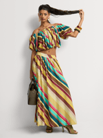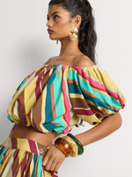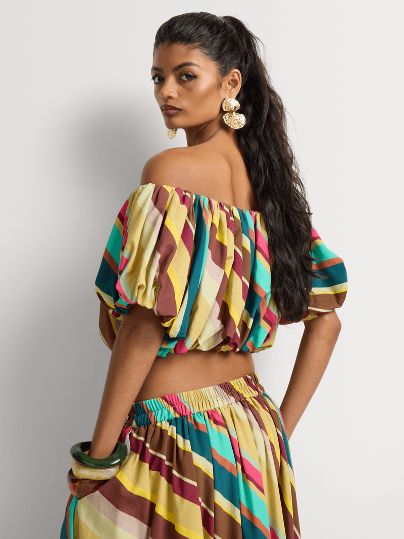 Bold and elegant, the Luella Stripe Off Shoulder Bubble Hem Top has a gorgeous off shoulder style with full, bubble sleeves and hem. Wear it with the coordinating maxi skirt for an on-trend matching set.
