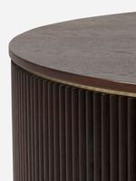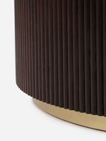The Malea Coffee Table in Walnut is a bold statement piece for the sophisticated home. Its oak and oak veneer top, finished in a deep ebony stain, exudes a moody, modern feel, while the striking fluted panel detailing adds texture and dimension. Grounded by a sleek brass plinth, this round coffee table blends rich wood tones and metallic accents, making it a luxurious centrepiece for contemporary living spaces.