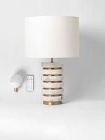 Enjoy gentle ambient lighting without unsightly wires or cords with our Rechargeable Bulb Marble Discs Table Lamp. This stylish lamp includes a USB rechargeable bulb and remote control so that it can be conveniently placed anywhere you like without needing to be near a plug point. It looks great in any room with its stacked marble base, brass accents, and modern drum shade while working through load shedding or blackouts.