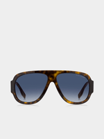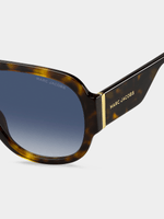 Designed to lend daily looks a fresh burst of character, the new men's eyewear collection evolves the daring and enduring vision of Marc Jacobs. Offering a timeless shape in sleek acetate, these sunglasses embrace the brand's quintessential styling with their bold proportions and signature accents: the distinctive metal plaque and the Marc Jacobs logo on the temples. Enhanced by seasonal colour combinations, selected styles are equipped with clip-on lenses.