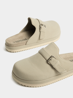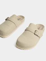 This chunky beige mule features a clean, minimal silhouette with a supportive sole and adjustable buckle detail, offering easy wear with a confident, contemporary edge—perfect for relaxed days that still call for considered style.