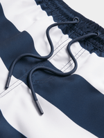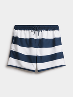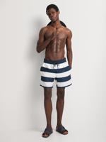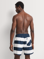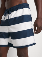 The Markham Men's Swimshort in Bold Horizontal Stripe Navy/Ecru is perfect for pool days or beach excursions. Made with high-quality polyester, it features a regular fit for maximum comfort. Easy to care for with warm wash instructions. Stand out in style with this trendy swimshort.