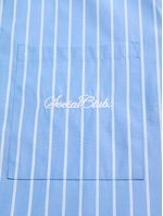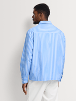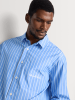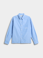 This boxy fit striped shirt is crafted from soft fabric, offering a relaxed silhouette with a clean, contemporary look. The blue and white stripes bring a fresh, timeless appeal to your everyday rotation.