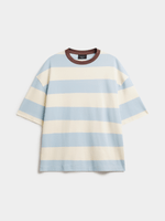 Refresh your casual rotation with the Markham Boxy Tee in Stone Blue, a modern statement piece built for easy, confident style. Designed in a boxy fit for relaxed structure, this tee features broad stone-blue and neutral stripes for a clean, contemporary look. The contrast neckline adds a sharp, elevated touch, giving the silhouette a refined point of difference. Crafted from soft, breathable cotton, it delivers everyday comfort with an effortless drape — perfect for laid-back denim days or styled-up streetwear moments.