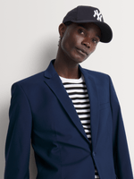Coordinates with matching navy trousers for a complete suit