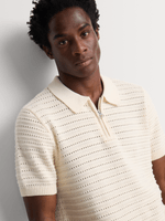 Elevate your style with the Markham Men's Crochet Zip White Knitwear Golfer. Hand wash only with a regular fit and made of comfortable cotton fabric. Perfect for any casual occasion, this golfer is a versatile addition to your wardrobe.