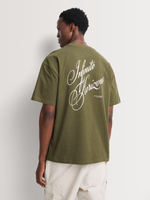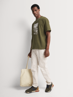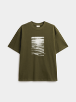 Introducing the Markham Horizon Graphic Sueded Jersey T-Shirt in a vibrant green hue. This relaxed fit tee is made from soft cotton for ultimate comfort. Featuring a cool wash, warm iron, and dry cleanable for easy care. Perfect for everyday wear and versatile styling.
