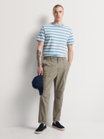 Elevate your casual style with the Markham Slim Fit T-Shirt in a stylish blue and milk horizontal stripe design. Crafted from comfortable cotton fabric, this tee is perfect for any laid-back outing. Easy to care for with cool iron and dry clean only instructions.