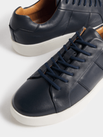 Step up your sneaker game with the Markham lace-up court sneaker in navy. Crafted from luxe leather, these kicks are perfect for any casual occasion. Reward yourself with these stylish and versatile sneakers today!