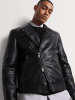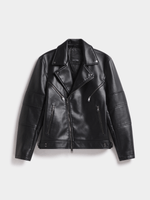 Introducing our Markham Neo Pleather Biker Jacket in sleek black. Made with high-quality PU fabric for a stylish, slim fit. Features cool iron and dry clean only. This jacket is perfect for adding a touch of edgy style to any outfit.