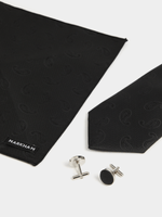 Refine your look with the Markham Men's Paisley Black Tie, Pocket Square and Cufflink Set. Featuring an intricate paisley design in a sleek black finish, this set adds subtle texture and timeless appeal. The coordinated pieces create a clean, polished look with effortless style. Designed for versatility, it pairs easily with a range of outfits. A sophisticated set that delivers confident detail with a modern edge.
