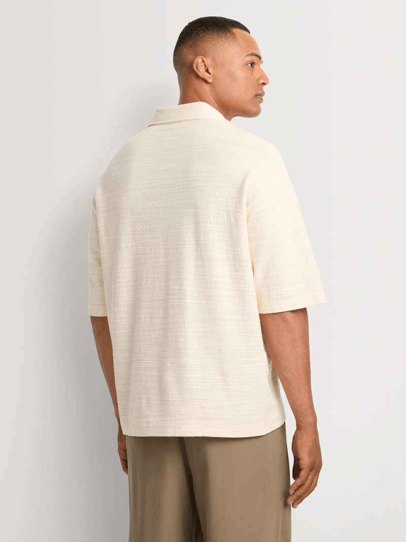 Clean, modern and quietly refined — this Regular Fit Knitted Button-Through Shirt is crafted from soft single-jersey knit for lightweight comfort with a premium feel. The natural tone and subtle textured floral design add understated character, making it the perfect warm-weather piece for effortless sophistication. Style it with tailored trousers or relaxed chinos and minimal sneakers for a clean, modern look.