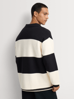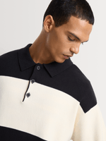 A bold essential defined by contrast and comfort. This relaxed fit black and ecru stripe knitwear golfer is crafted from breathable cotton, delivering structured style with an easy, modern feel.