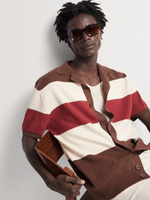 The Markham Men's Revere Stripe Button Knitwear showcases bold horizontal stripes in vibrant shades of orange and navy, complemented by a classic button-down design. Crafted from 100% cotton, this knitwear piece ensures comfort and style, making it an ideal choice for casual outings or relaxed gatherings.