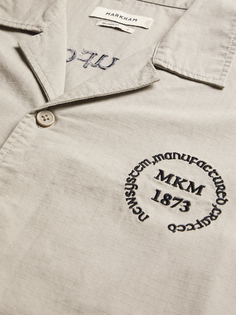 Introducing the Markham Script Embroidery Natural Shirt, crafted from comfortable cotton with a relaxed fit. This shirt features cool wash instructions, warm ironing, and is dry cleanable. It is available in a versatile sand color. Perfect for any casual occasion.