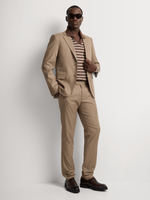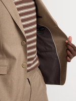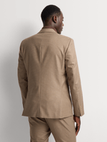 A refined tailored layer with subtle texture and modern polish. This slim fit caramel jacket features a micro-check pattern and poly-viscose fabrication for a sharp, structured finish.