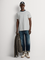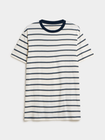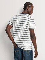A clean essential with a sharp, modern edge. This Slim Fit Stripe T-Shirt brings together a refined off-white base with narrow navy and fatigue-toned stripes, creating a look that’s understated but confidently stylish. The contrast navy crew neckline adds definition and elevates the silhouette without overpowering your fit. Crafted from soft, breathable cotton, it delivers a smooth, lightweight feel — perfect for warm days, layered looks, or easy weekend styling.