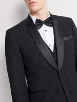 Make a statement at every formal occasion with the Markham Slim Fit Black Brocade Tuxedo Jacket. Crafted from a sleek black brocade fabric, it delivers subtle texture and elevated refinement. The slim-fit cut sharpens your silhouette, while the satin peak lapels and single-breasted finish bring classic tuxedo sophistication. Perfect for weddings, black-tie events and evenings that demand standout style.