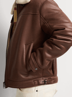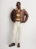 A timeless outerwear piece with rugged, refined appeal. This smart slim fit brown aviator jacket features a polyester finish and structured silhouette for elevated cold-weather styling.