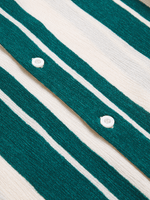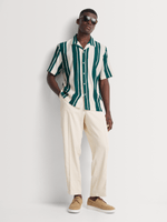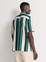 Introducing the Markham Stripe Crinkle Shirt. Stay stylish in this green/ecru shirt with a relaxed fit. Made from a poly spandex blend, it offers comfort and versatility. Easy care instructions: warm wash, cool iron, dry cleanable. Perfect for any occasion.