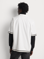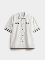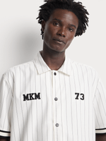 The clean ecru base is accented with sleek vertical pinstripes, creating a timeless, sporty look. Embroidered details, including the "MKM" and "73" motifs on the chest, add a bold edge, while the contrast-striped cuffs and hem provide an athletic finish. The button-down front and relaxed short sleeves make it a versatile choice — perfect for layering or wearing solo.
