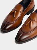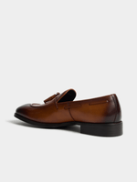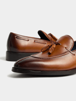 Step out in style with the Markham premium tan loafer featuring a tassle laced upper. Crafted from luxurious leather, this sophisticated shoe offers both comfort and class. Perfect for any occasion, elevate your look with this timeless footwear essential.