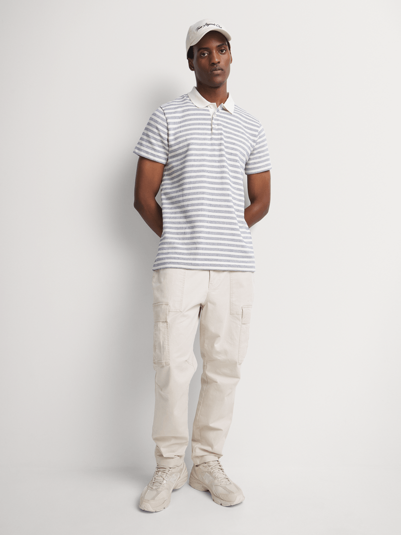 Stay stylish in the Markham textured stripe button golfer in navy/white. Made from comfortable cotton, this golfer features a regular fit for easy wear. Care is a breeze with cool wash, warm iron, or dry clean options. Perfect for any casual occasion.