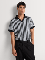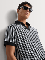 This vertical striped revere collar golfer delivers confident, statement style with an elevated edge. The open neckline creates a relaxed, fashion-forward silhouette, while the striking stripe design keeps the look sharp and contemporary.