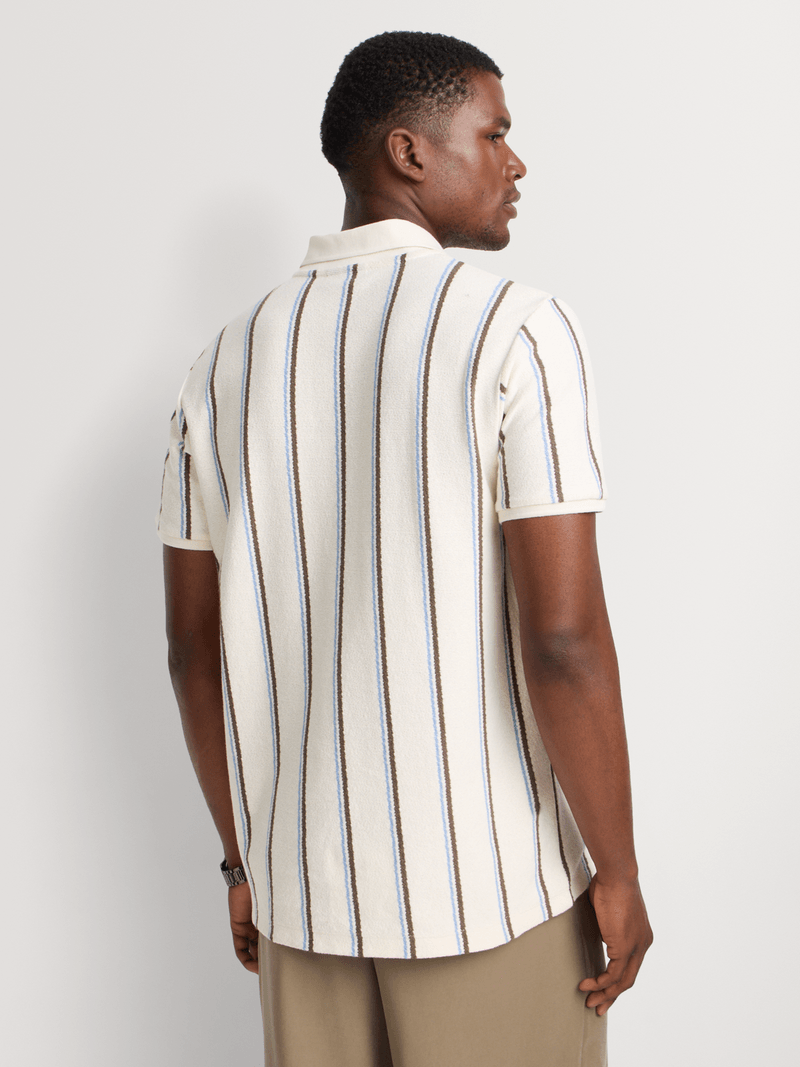 Elevate your casual style with the Markham Vertical Textured Striped Button Golfer. Crafted with a cozy cotton blend, this golfer features a unique texture and stylish button detailing. Easy to care for with warm wash instructions, it offers a regular fit for all-day comfort. Perfect for any casual occasion.