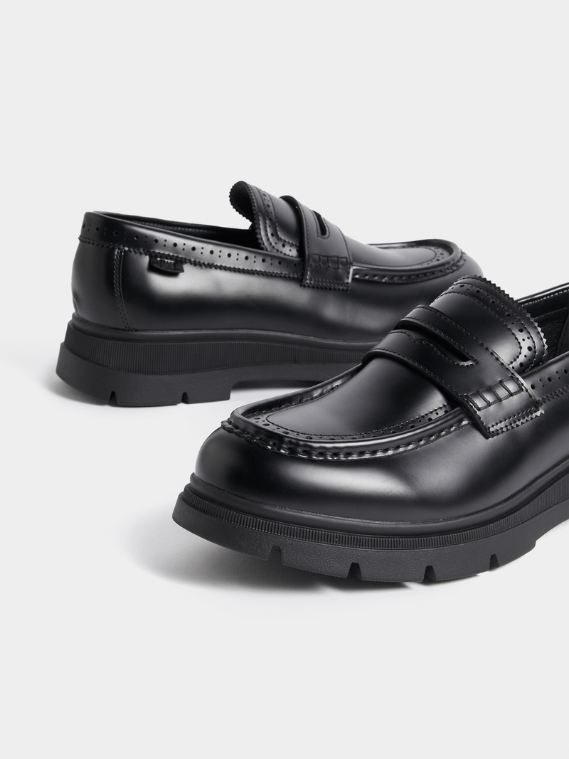 Experience style and comfort with Markham Mens Chunky Pin Punch Black Loafers. These elegant loafers, constructed from 100% PU, feature a distinctive pin punch pattern across the upper, adding a refined touch. Ideal for men who appreciate durability and timeless design. Perfect for both casual and formal settings.