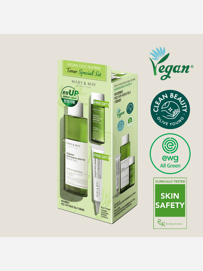Gentle yet potent, the Mary&May Vegan CICA Tea Tree Toner Special Set includes both full and travel-sized toners plus a brightening eye cream. Powered by tea tree, CICA (Centella Asiatica), AHA/PHA exfoliants, and skin-soothing botanicals, it calms breakouts, refreshes dull skin, and targets dark circles — all in a vegan-friendly formula.