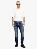 This stretch denim is made with partially recycled cotton. The dark blue wash showcases a destroyed DNA look, with boldly contrasting whiskers and ripped and repaired abrasions.
