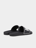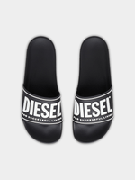 These pool slides are styled with moulded footbeds and gripped logo soles. The wide upper band is branded with a 3D Diesel For Successful Living logo and trim.