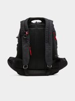 Built from check-jacquard shell, this backpack is a unisex accessory infused with cool functional details. It has bungee cords to expand or compress its size, a pocket on one of the shoulder straps, and a chunky front zip that’s traced with metal logo lettering all along the length. The contrasting red pulls pop against the all-black design.