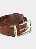 Responsible Collection vegetable-tanned leather belt. It fastens with a pin buckle and has a pair of loops—one in leather, the other in metal—that share the Diesel branding.