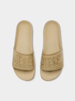 These pool slides are styled with moulded footbeds and gripped logo soles. The wide upper band is branded with a 3D Diesel For Successful Living logo and trim.