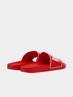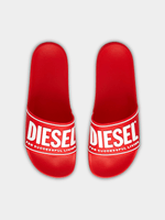 These pool slides are styled with moulded footbeds and gripped logo soles. The wide upper band is branded with a 3D Diesel For Successful Living logo and trim.